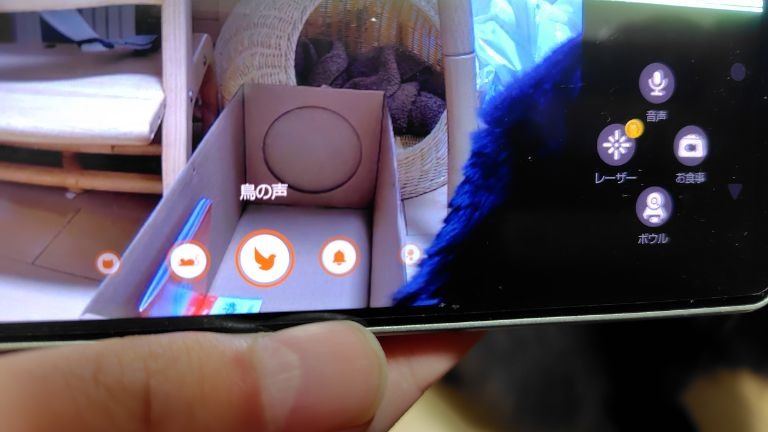 カメラ画面は横に拡大することも可能。この画面では、猫を見守る以外にもロボットから鳥やネズミの声、ベルの音を出して猫の興味を引かせることもできます。他にも、レーザー遊び、音声通話、フード給餌、ボウル注視ができたり、カメラ撮影も行えます。まさに万能ですね。