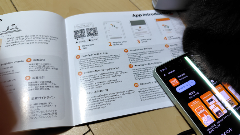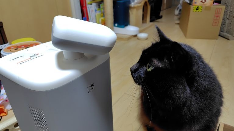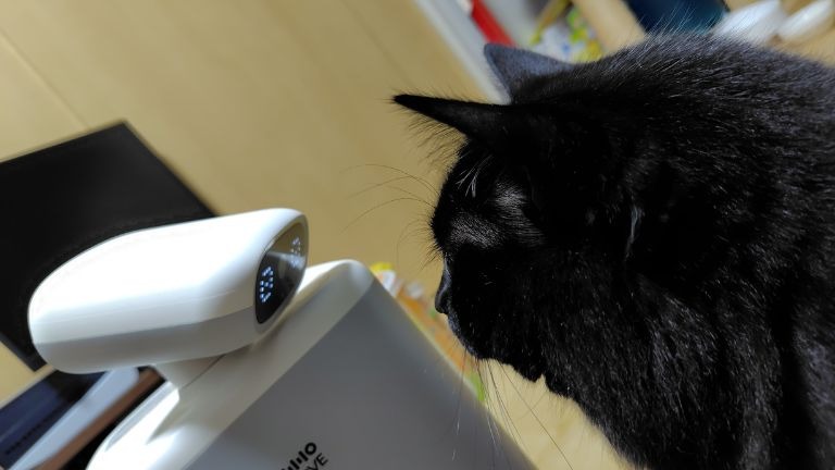 搭載されているカメラが動いたときには、トモくんも一瞬「ん?」という顔で見上げる場面がありましたが、怖がるほどではありません。むしろ慣れてくると、カメラ部分に向かって軽く猫パンチを繰り出す余裕まで見せるほど。