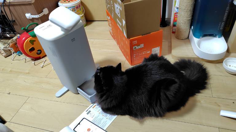 まず、「O Sitter 猫用スマート見守りロボット」に対するトモくんの反応ですが、新しい自動給餌器を前にしても物怖じする様子はありませんでした。