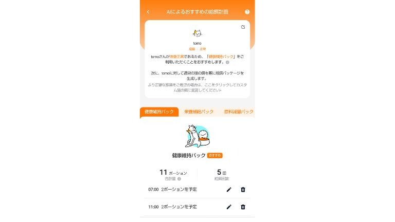 猫の給餌計画も簡単に用意できるところも注目ポイント。なんとAIが猫の条件に合った給餌プランを立案してくれるのです。もちろん、フードの種類や猫の状態、食欲に応じて計画の微調整も可能。筆マークを押せば細かく調整できます。